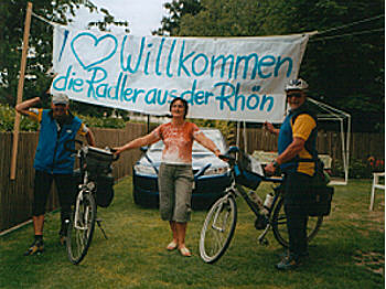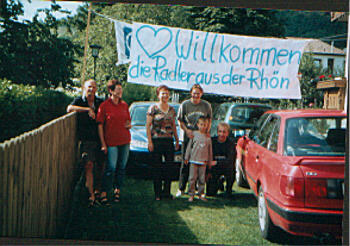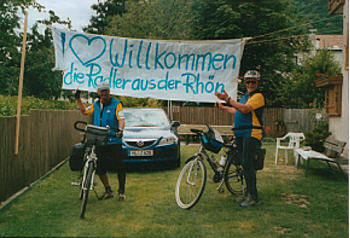 | Ich hatte mit Peter ausgemacht, dass wir um 16.00 Uhr da sind, waren aber schon um 15.00 Uhr in Algund. Wir sind dann zum Cafè "Andrea" gefahren und haben uns einen Cappuccino und ein Stück Kuchen genehmigt. Kurz nach 16.00 Uhr sind wir dann zur Wohnung gefahren. Sieglinde hat schon auf uns gewartet. "WIR GRÜSSEN DIE RADLER AUS DER RHÖN" stand auf dem Transparent, dass Peter als Zieleinlauf aufgehängt hatte. Nach dem Duschen haben wir richtig gefeiert mit allem was dazugehört. Unsere bessere Hälften mußten einen Tag früher anreisen, weil wir so schnell am Ziel waren. |